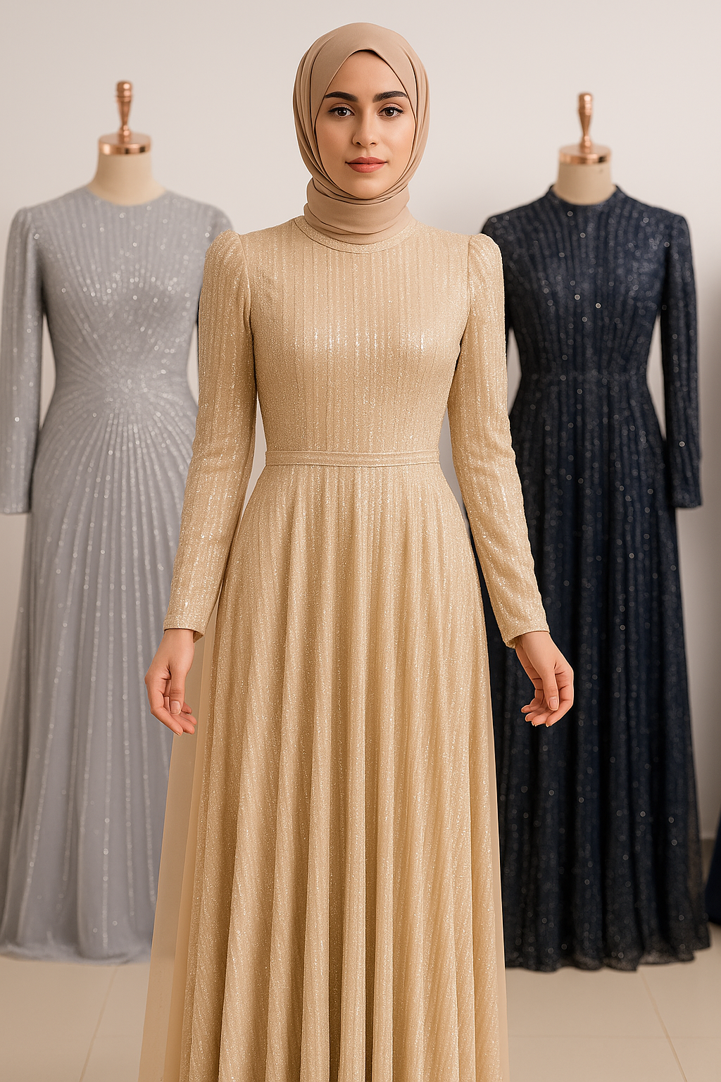 Tamamı sim işlemeli bu şık bej abiye elbise, zarafeti ve ışıltısıyla ön plana çıkıyor. Uzun kollu ve tam boy tasarımıyla tesettüre uygun şekilde hazırlanmış olup, özel davetler, düğün ve nişan organizasyonları için ideal bir tercihtir. Modern kesimiyle klasik şıklığı bir araya getirir.