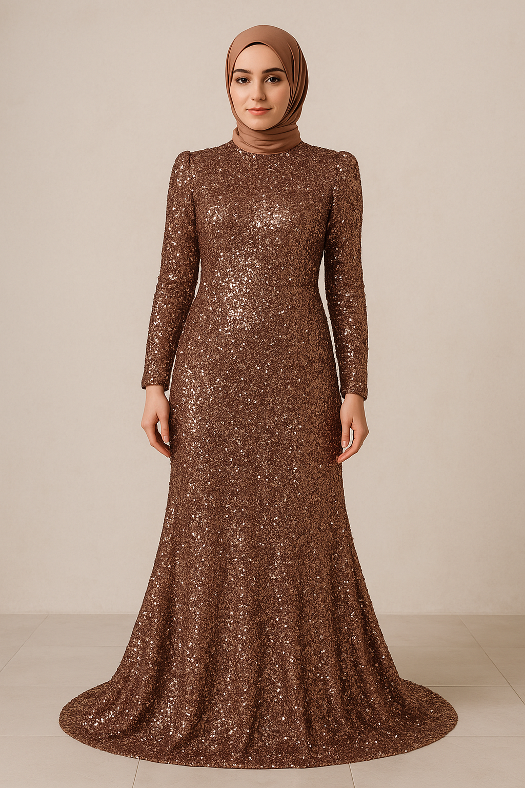Bronz Payetli Tesettür Abiye – Işıltılı Tasarım