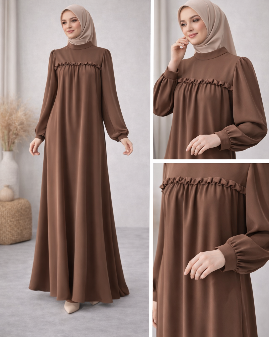 Zarif detaylarla sade şıklığı buluşturan Fırfır Detaylı Kahverengi Tesettür Elbise, günlük ve özel kombinlerde rahatlıkla tercih edilebilecek zamansız bir tasarımdır. Göğüs hattında yer alan ince fırfır detayı elbiseye feminen bir hava katarken, dökümlü formu vücut hatlarını zarif şekilde dengeler.