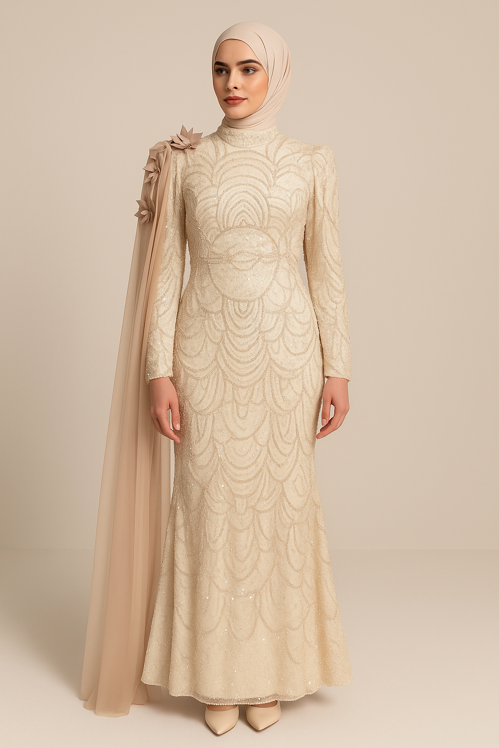Krem İşlemeli Tesettür Abiye, ince işçiliğe sahip boncuk ve payet işlemeleriyle lüks bir görünüm sunuyor. Vücudu saran zarif kesimi ve omuzdan aşağı süzülen tül detayı, elbiseye hareket ve asalet katıyor. 3D çiçek aksesuarları ise tasarımı modern ve iddialı bir hale getiriyor. Krem rengin zarafeti sayesinde düğün, nişan, söz ve tüm özel davetlerde göz kamaştıran bir şıklık sağlar. Minimal aksesuarlarla kombinlendiğinde bile tek başına iddialı bir stil oluşturur.