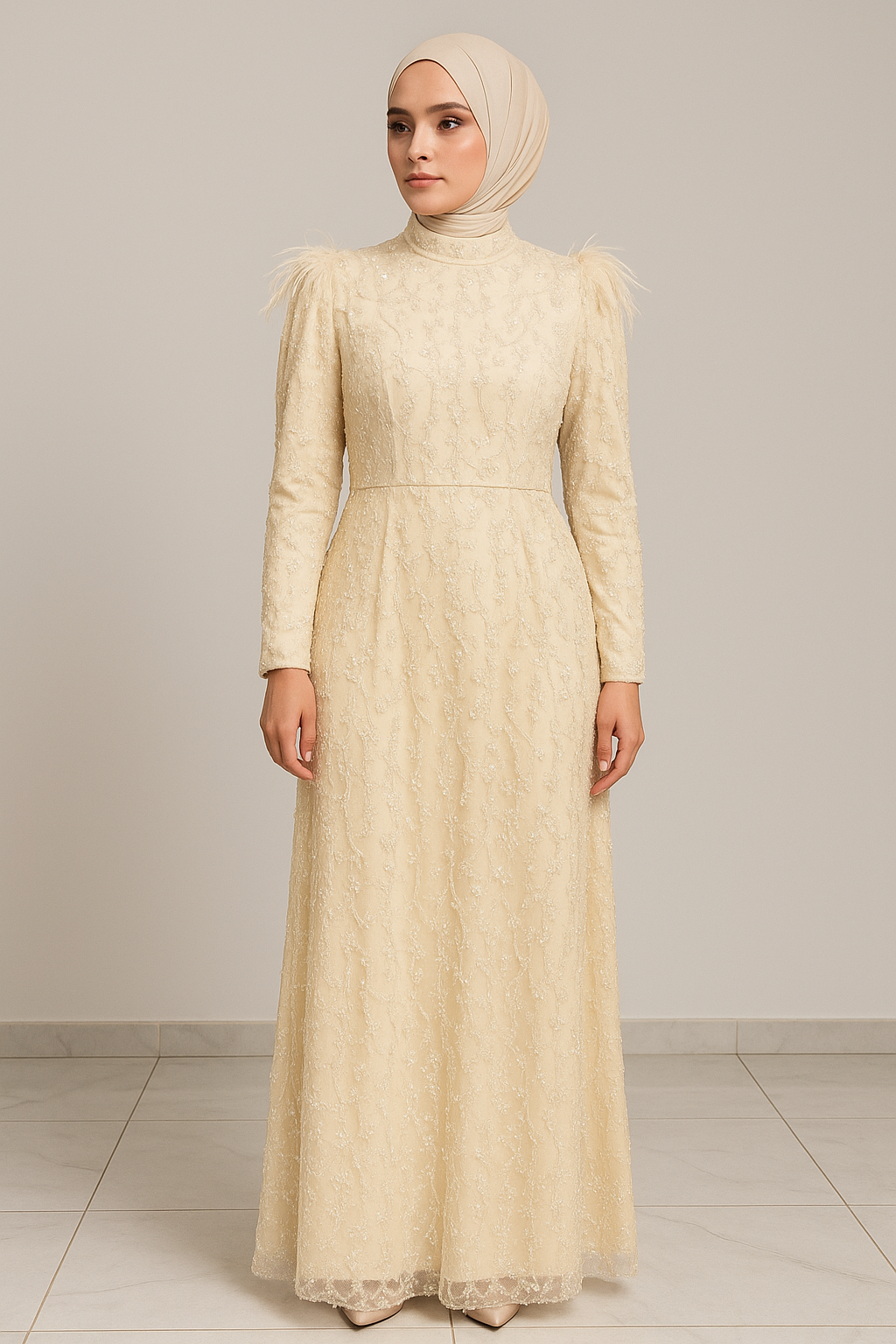 Tüy ve inci işlemeleriyle dikkat çeken krem tesettür abiye, özel günlerde şıklığınızı taçlandırır.