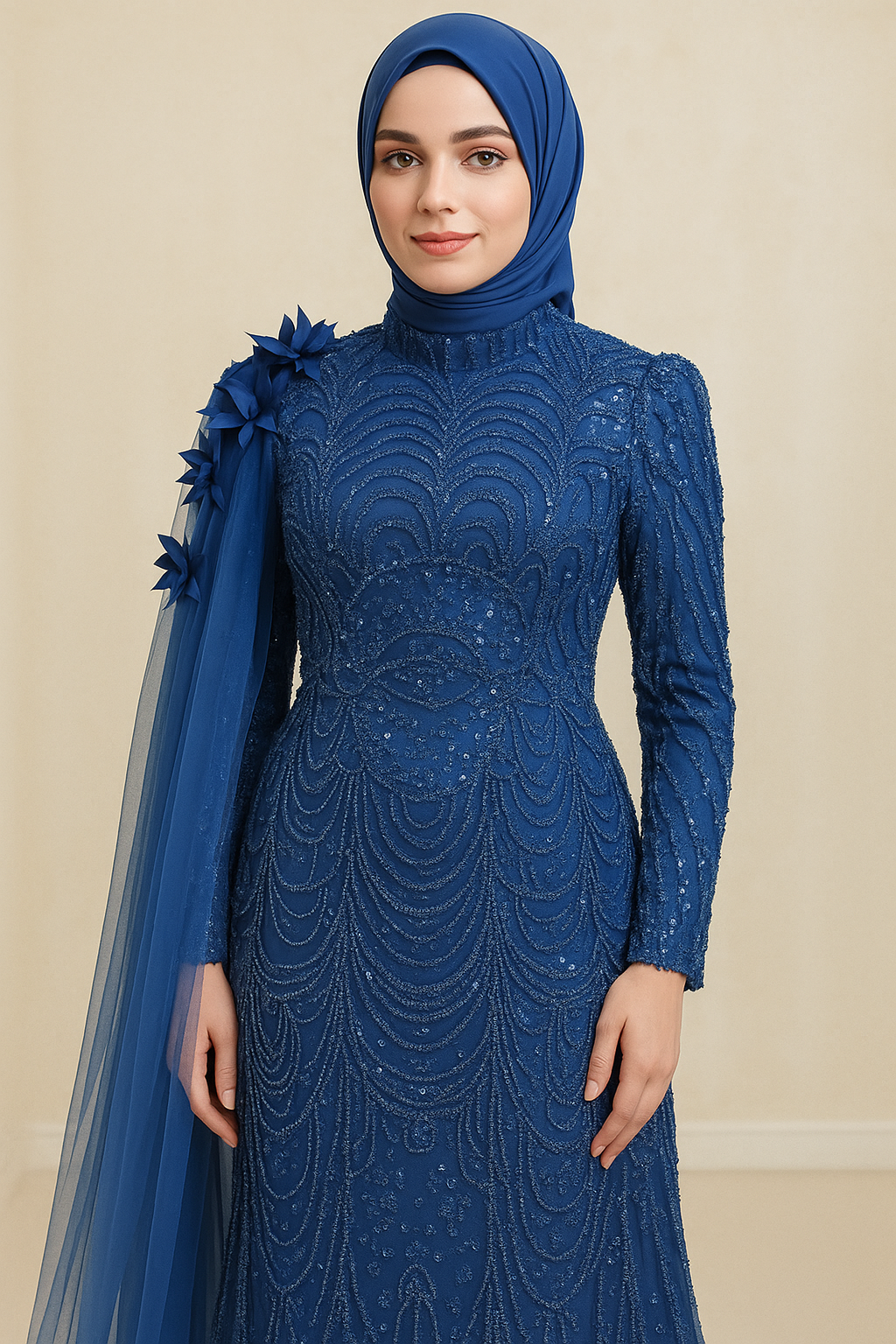 Mavi Çiçek Detaylı İşlemeli Tesettür Abiye, asil ve modern tasarımıyla özel davetlerde şıklığınızı tamamlayacak göz alıcı bir parçadır. Elbisenin yüzeyinde yer alan yoğun payet işlemeler, ışık altında zarif bir parıltı oluştururken, omuzdan aşağıya süzülen tül ve 3D çiçek detayları romantik bir dokunuş katar. Modern çizgilerle hazırlanmış bu model, nişan, düğün, mezuniyet ve tüm özel organizasyonlarda sizi ön plana çıkarır.