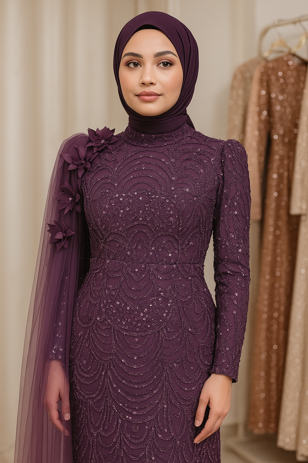 3D çiçek aplikeleri ve ince payet işlemeleriyle göz kamaştıran mor tesettür abiye.
