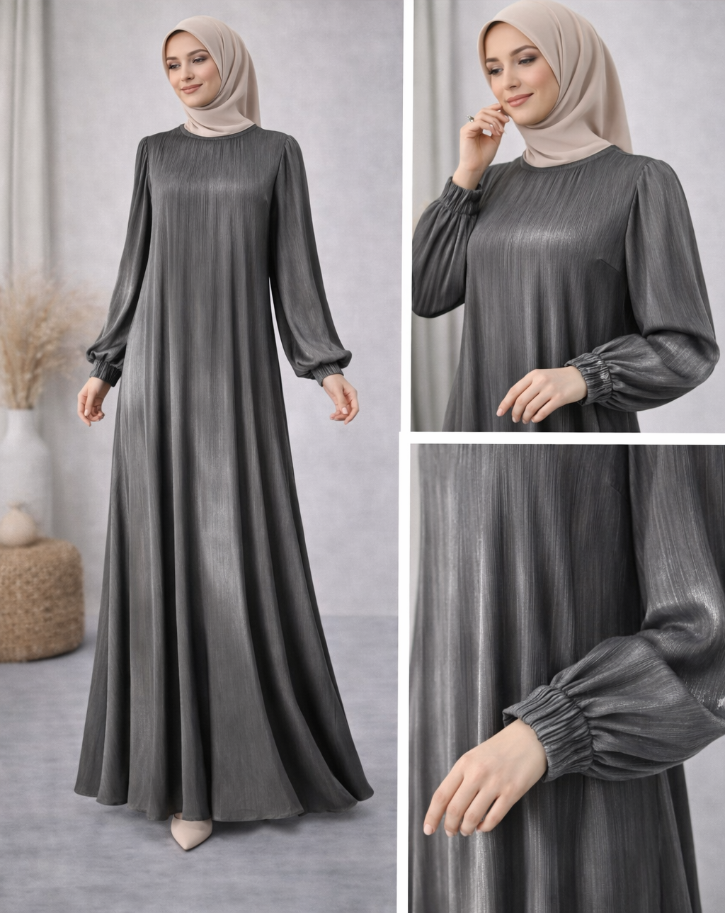 Modern dokusu ve zamansız rengiyle dikkat çeken Parlak Dokulu Antrasit Tesettür Elbise, günlük şıklığı zarafetle birleştiren özel bir tasarımdır. Elbisenin ince parlak yüzeyi ışığı yumuşak şekilde yansıtarak modele sofistike bir görünüm kazandırır.