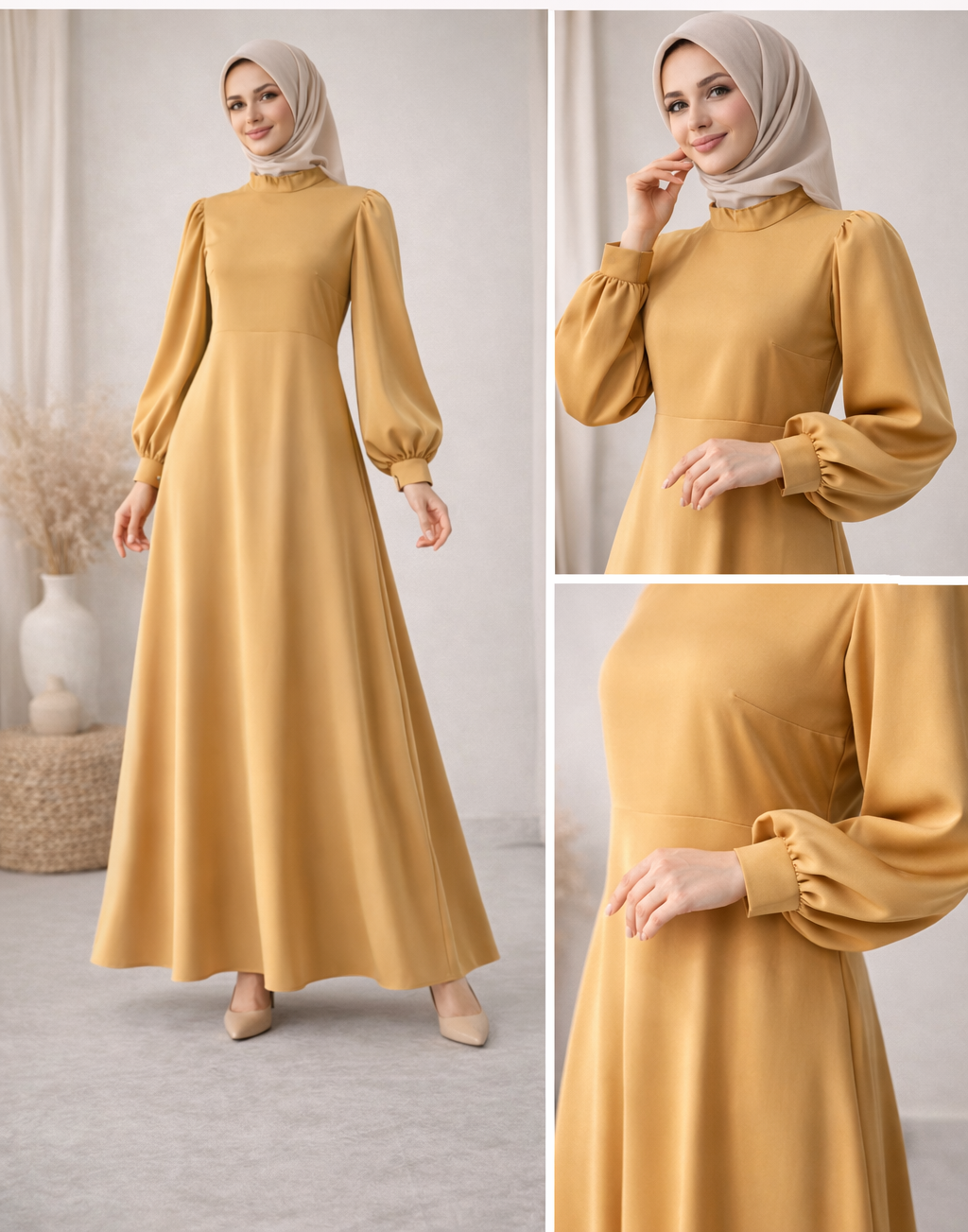 Minimal şıklığı sevenler için tasarlanan Sade Balon Kol Hardal Tesettür Elbise, zamansız duruşu ve rahat kesimiyle gardırobunuzun kurtarıcı parçalarından biri olmaya adaydır.