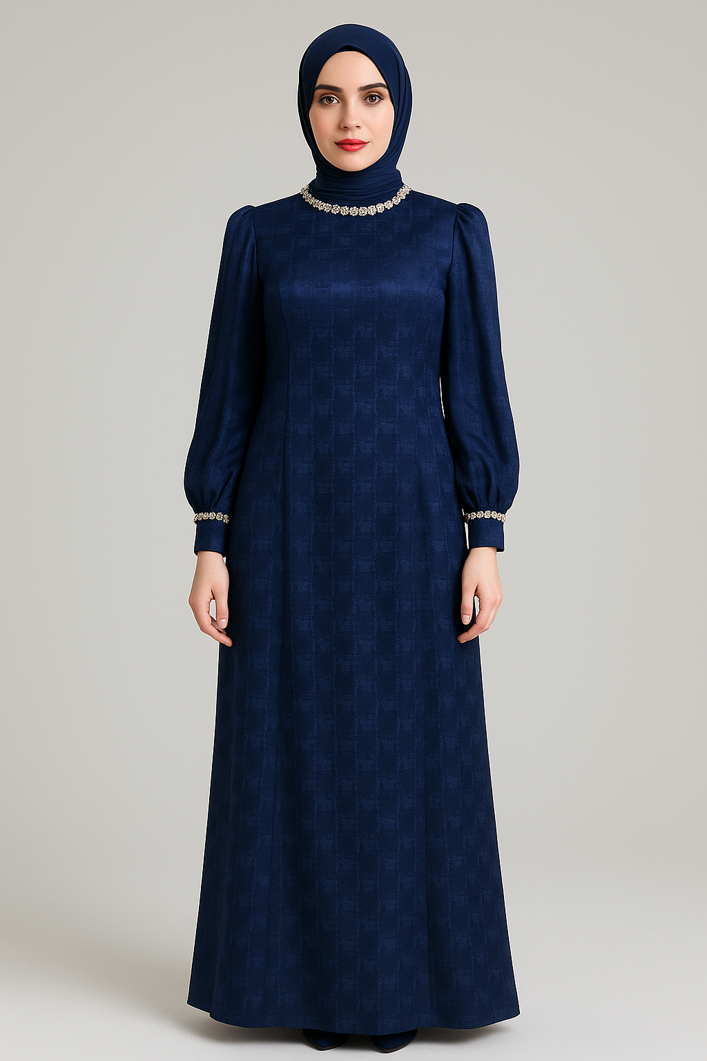 Saten Dokulu Lacivert Tesettür Elbise, şık dokusu ve göz alıcı taş detaylarıyla hem klasik hem de modern bir tarz sunar. Yuvarlak yaka kısmındaki taş işlemeleri ve manşetlerdeki zarif süslemeler elbiseye ışıltı katarken, lacivert rengin asaletiyle birleşerek özel davetlerde sofistike bir görünüm sağlar. Rahat kalıbı sayesinde konforlu bir kullanım sunan bu model, düğün, nişan ve davetler için ideal bir seçimdir.