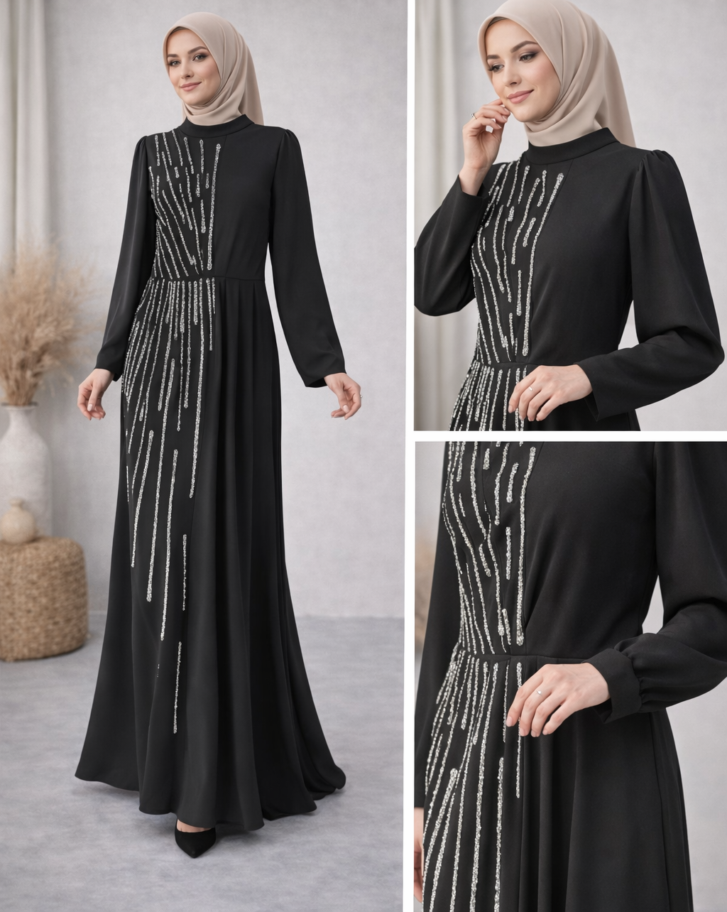 Modern çizgileri ve zarif ışıltısıyla öne çıkan Sim Çizgi Detaylı Siyah Tesettür Abiye Elbise, özel günlerde güçlü ve sofistike bir stil arayanlar için tasarlanmıştır. Elbisenin ön yüzeyinde yer alan dikey sim çizgi detayları, modele hareket kazandırırken vücut formunu zarif şekilde dengeler.