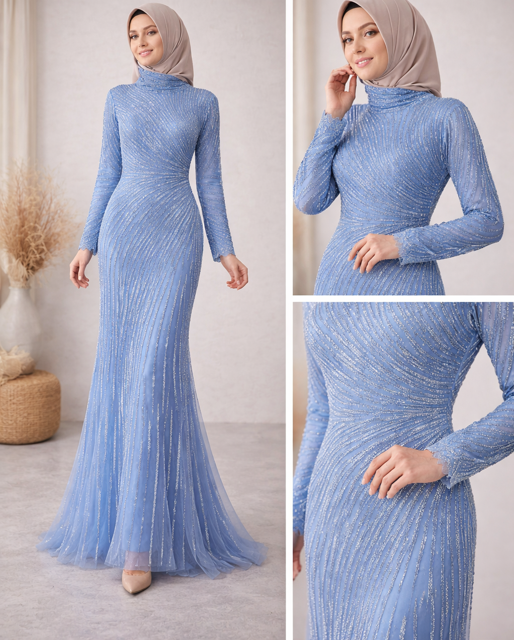 Vücuda nazikçe oturan kesimi sayesinde zarif bir siluet oluşturur. Uzun kollu ve uzun boy tasarımıyla tesettür giyime uygun olan bu model, düğün, nişan, davet ve gece organizasyonlarında rahatlıkla tercih edilebilir.