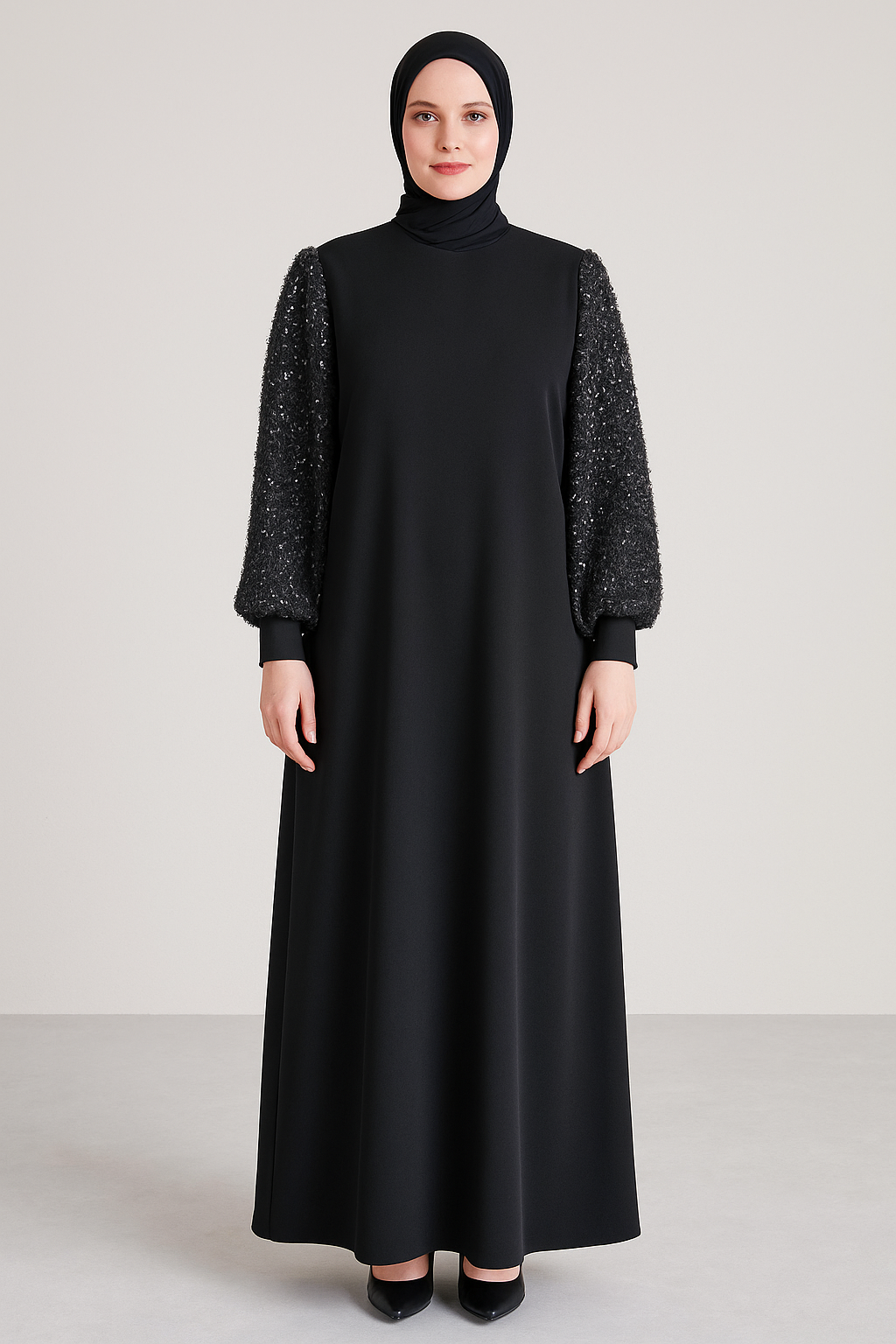 Simli kol detaylı, sade ve zarif siyah abiye elbise.