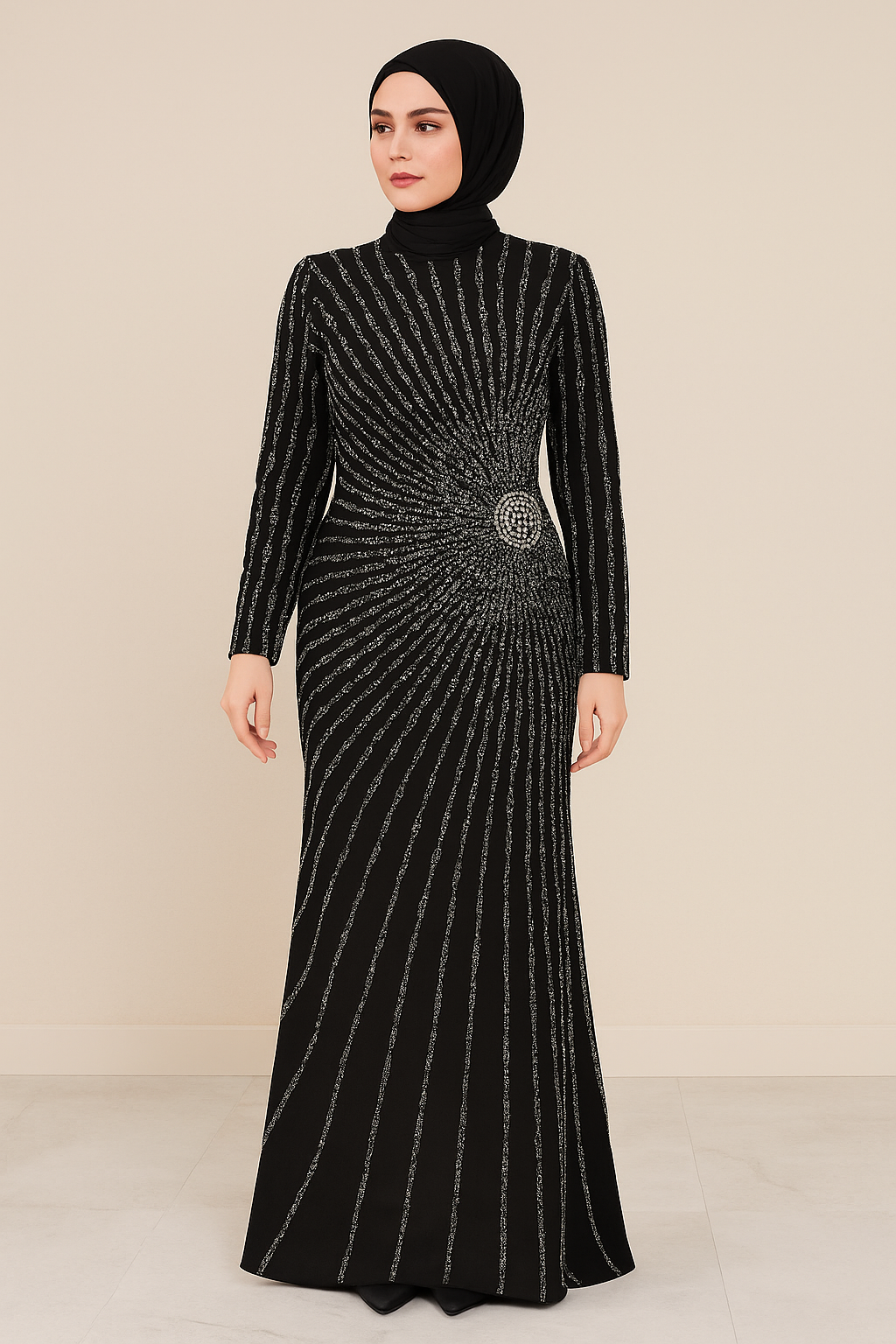 Siyah Işıltılı Tesettür Abiye – Güneş Motifli Tasarım