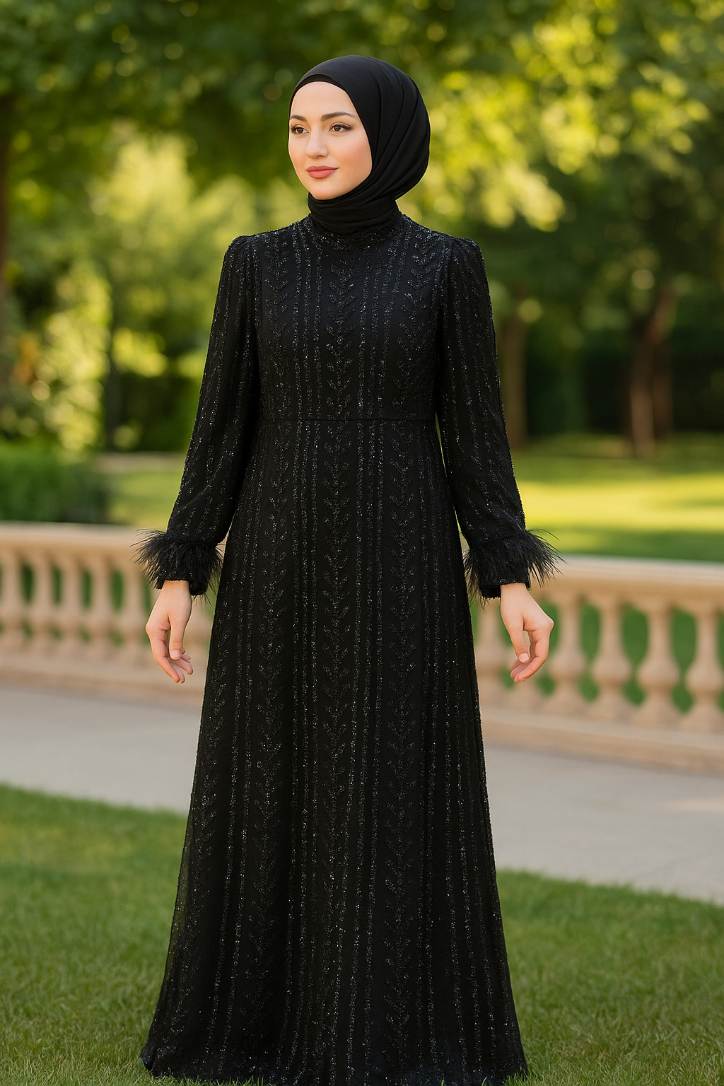 Siyah Sim İşlemeli Tesettür Abiye, baştan sona işlenmiş ince sim detaylarıyla göz kamaştıran bir tasarıma sahiptir. Kol uçlarındaki tüy süslemeleri, elbiseye modern bir dokunuş katarken, uzun kollu ve tam boy tasarımı tesettürlü hanımlar için hem şıklık hem de rahatlık sunar. Siyah rengin asaleti, düğün, nişan, mezuniyet ve tüm özel davetlerde zarafeti ön plana çıkarmak isteyenler için ideal bir seçimdir.