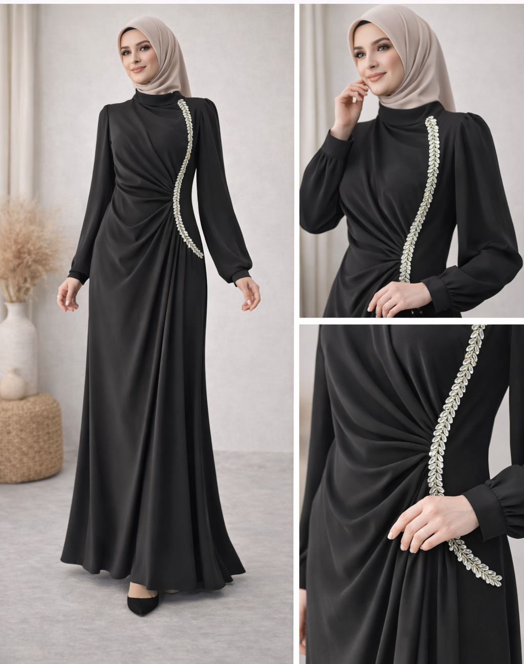 Asaletin ve zarafetin simgesi olan Taş Detaylı Drapeli Siyah Tesettür Abiye Elbise, modern ve sofistike tasarımıyla özel günlerde stilinizi ön plana çıkarır. Elbisenin ön kısmında yer alan akıcı drape detayları vücuda zarif bir form kazandırırken, çapraz şekilde uzanan taş işlemeler modele göz alıcı bir ışıltı katar.