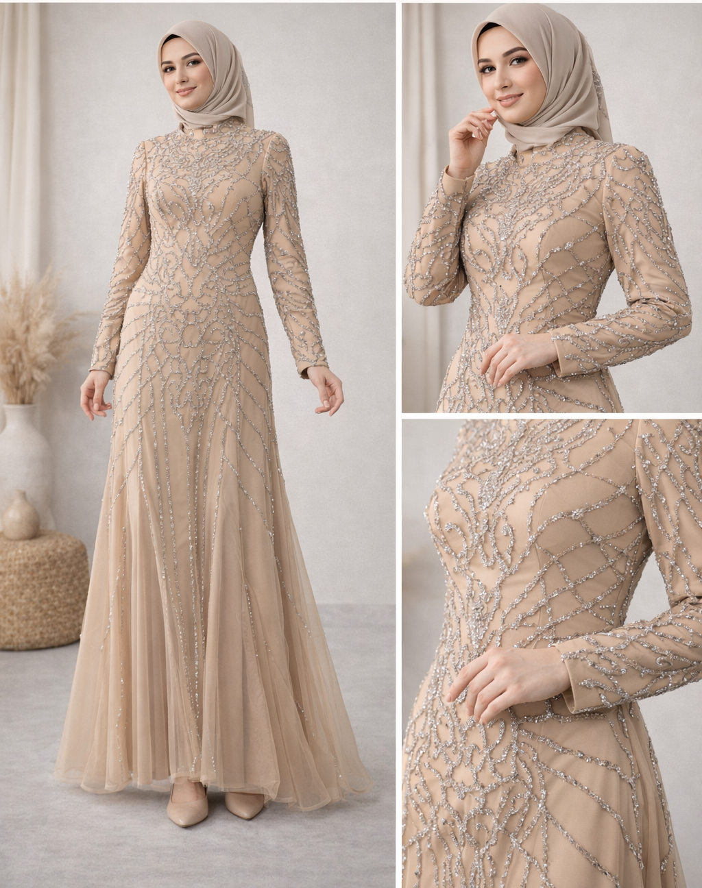 Işıltılı detaylarıyla dikkat çeken Taş İşlemeli Bej Abiye Tesettür Elbise, zarif ve iddialı bir görünüm sunmak isteyenler için özel olarak tasarlanmıştır. Elbisenin tamamına yayılan simetrik taş işlemeler, modele lüks ve sofistike bir hava kazandırır.