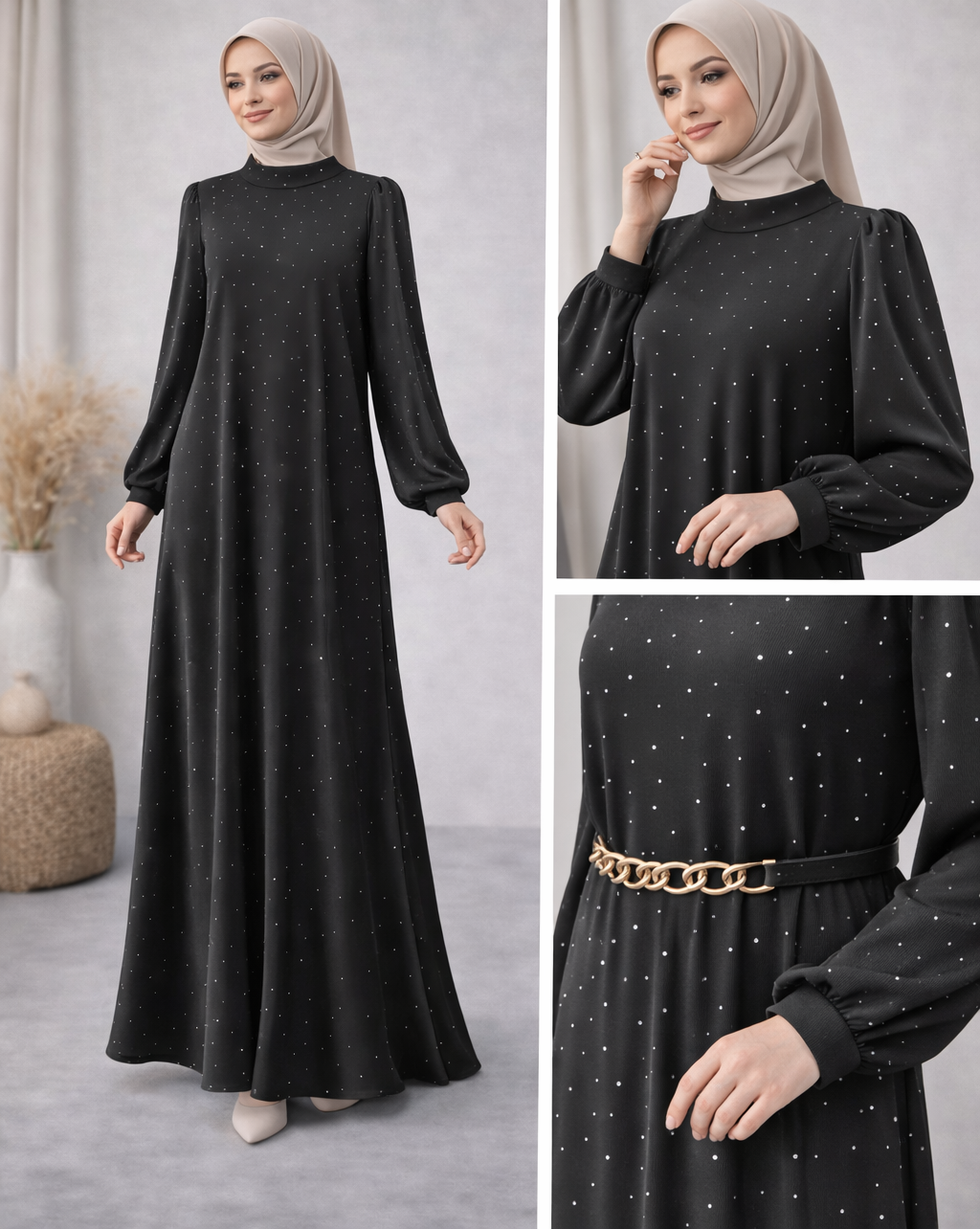 Minimal şıklığı modern detaylarla buluşturan Taş Nokta Detaylı Siyah Tesettür Elbise, sade ama dikkat çekici bir stil sunar. Elbise yüzeyine serpiştirilmiş taş nokta desenleri, siyah rengin asaletiyle birleşerek zarif bir görünüm oluşturur.