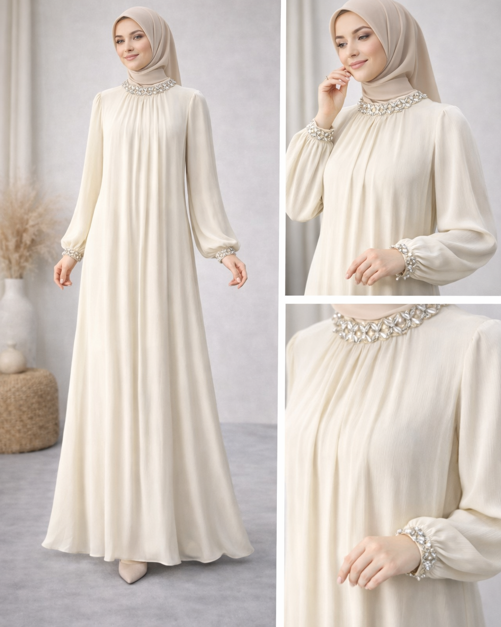 Zarafeti ve sadeliği kusursuz şekilde bir araya getiren Taş Yakalı Krem Tesettür Abiye Elbise, özel davetlerde sofistike bir stil sunmak isteyenler için tasarlanmıştır. Yaka kısmında yer alan ışıltılı taş işlemeler, elbiseye zarif bir şıklık katarken abartıdan uzak, dengeli bir görünüm sağlar.