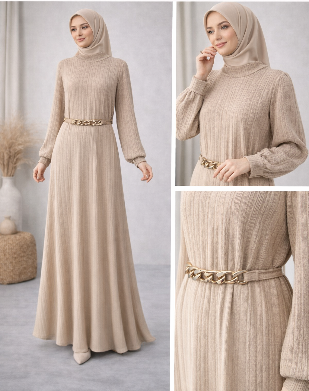 Şıklığı ve rahatlığı aynı tasarımda buluşturan Triko Dokulu Zincir Kemerli Bej Tesettür Elbise, modern ve zarif bir stil arayanlar için ideal bir tercihtir. Dikey triko dokusu sayesinde elbise vücuda zarif bir form kazandırırken, uzun kesimiyle dengeli ve şık bir siluet oluşturur.