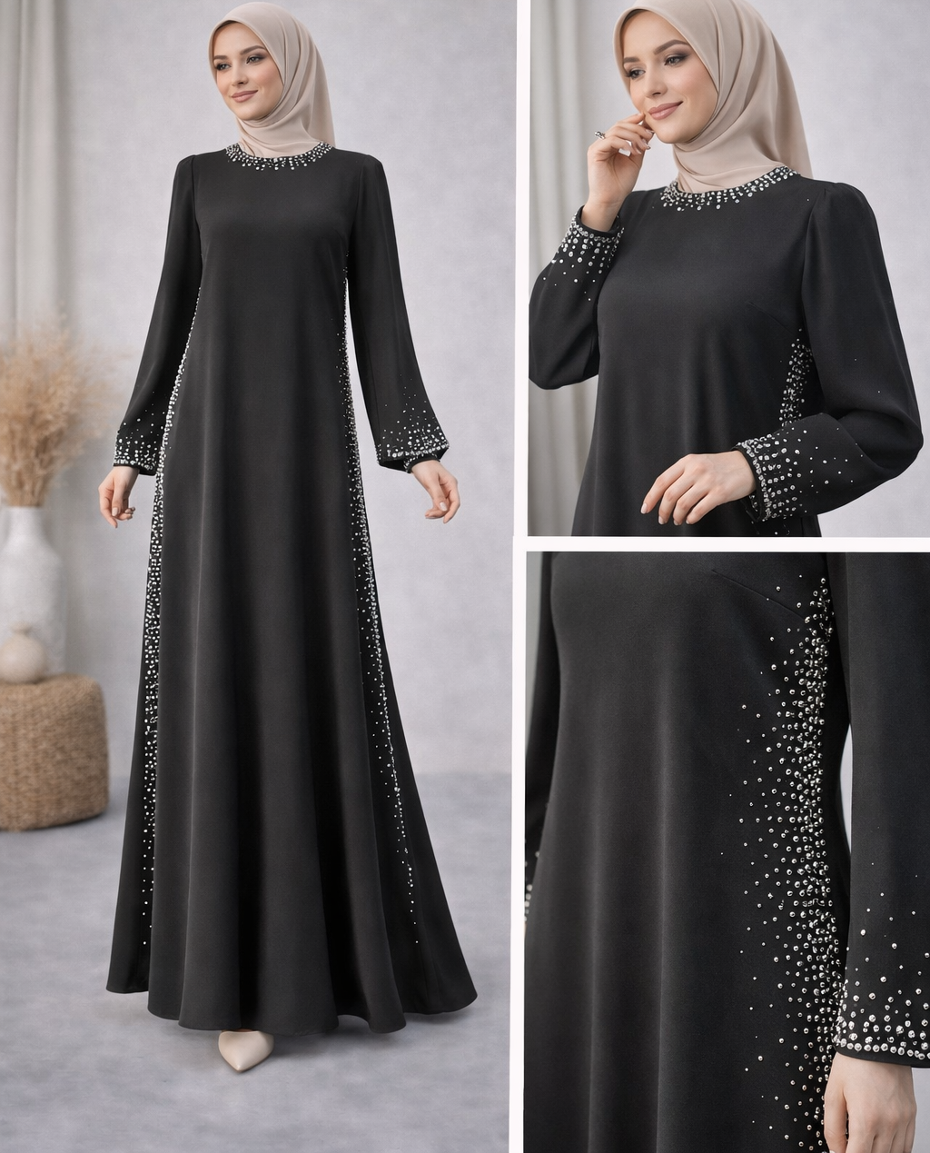 Asil siyah rengin zarif taş detaylarla buluştuğu Yan Taş İşlemeli Siyah Tesettür Abiye Elbise, özel davetlerde güçlü ve şık bir duruş sergilemek isteyenler için tasarlanmıştır. Elbisenin yan panellerinde ve kol uçlarında yer alan taş işlemeler, tasarıma hareket ve ışıltı katarken dengeli ve sofistike bir görünüm oluşturur.