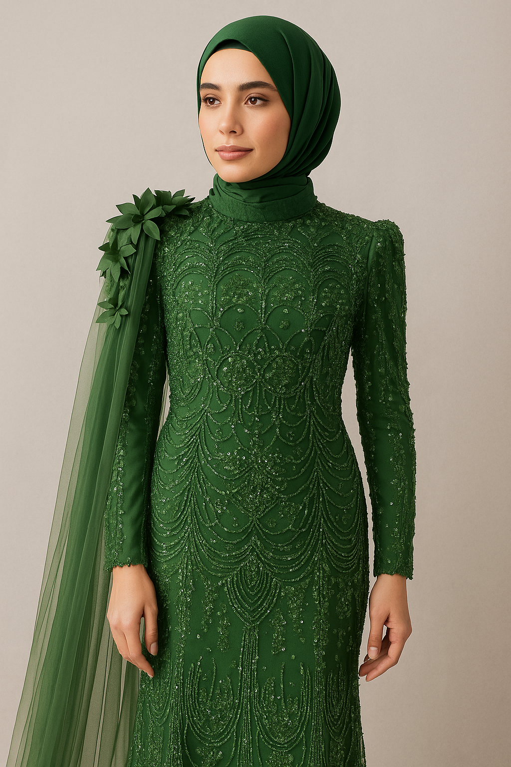 Işıltılı işlemeleri ve omuzdan inen tül çiçek detaylarıyla göz kamaştıran yeşil tesettür abiye.